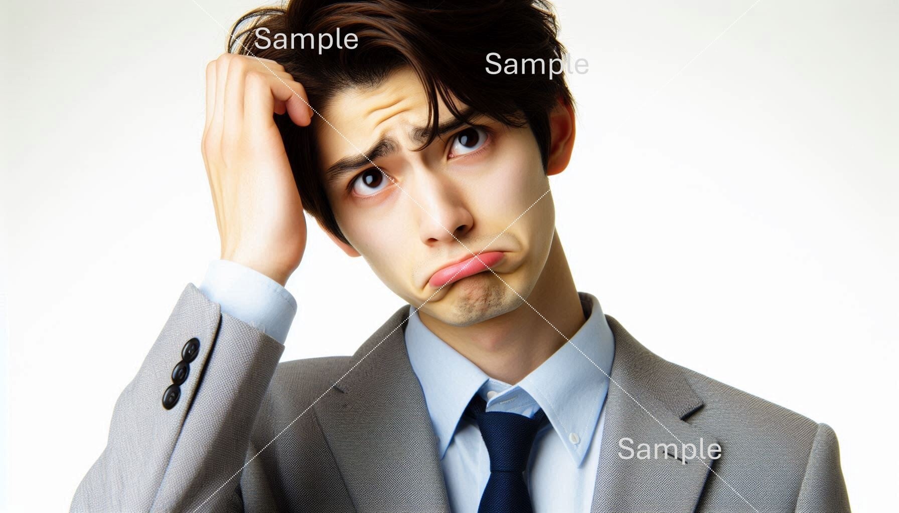 人物素材ー困った若い男性会社員サラリーマン風イメージ People material - image of a young businessman in trouble PNG <AI生成> | 企画書・提案書作成事例・素材ショップ Japan Proposal examples and material Shop